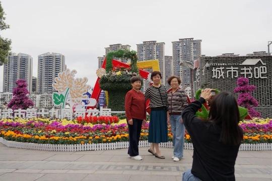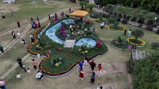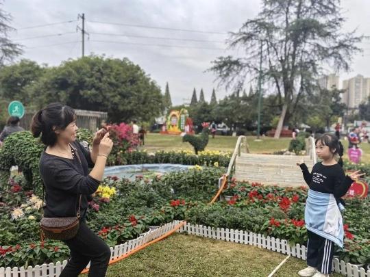 本届菊花艺术展不仅规模宏大,而且主题丰富,艺术感强。核心展区位于熙春公园内,以“小桥流水”形象造景,巧妙地将“十二生肖”元素融入其中,让花草充满了灵气,广受市民喜爱。家住附近的蔡先生每天都带孙子来“打卡”,绕着花草做成的“兔子”“老虎”“小狗”等唱儿歌、讲故事,嬉戏玩乐。“菊花展让我们有地玩,又能让孩子增长知识,比如认识生肖、学会爱护花草,很有意义。”蔡先生表示。