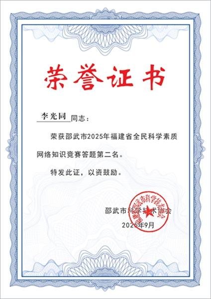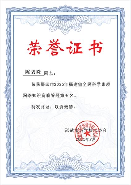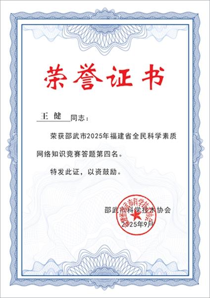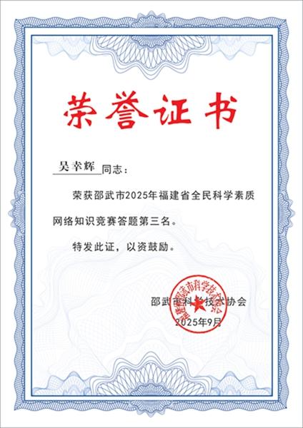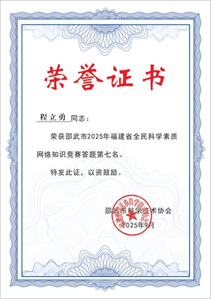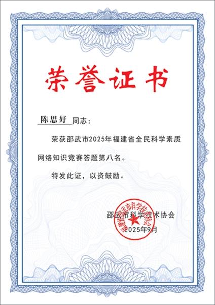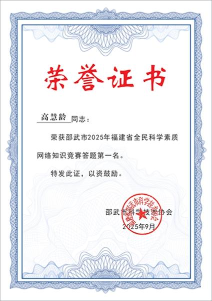 为深入贯彻习近平总书记关于科学普及和科学素质建设工作的重要指示批示精神,落实《福建省“十四五”全民科学素质行动规划纲要实施方案》,邵武市科协精心组织开展以“@邵武市2025年福建省全民科学素质网络竞赛火热来袭!”为主题的网络竞赛活动。活动期间,通过邵武融媒等官方公众号全面发布竞赛规则、参赛指南、科普知识、参与方式及奖励机制,广泛动员市民参与。 本次竞赛历时四个月,得到社会各界积极响应与支持。为表彰先进、激发全民学科学的热情,根据竞赛规则评选出全市前100名优秀参赛者,市科协将为其颁发荣誉证书及奖品。现将竞赛前十名获奖人员予以公示展示: 1. 第一名: