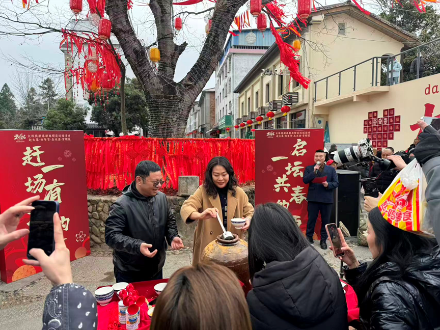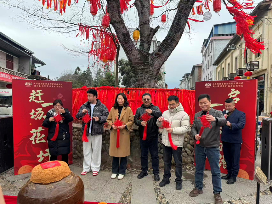 启酒同饮,举杯共春。开酒共饮作为核心环节,将氛围推向高潮。领导嘉宾携手完成揭红启封、敲泥除尘等仪式,开启藏着樱香与福运的 “共春酒”。福酒分赠现场来宾,众人举杯同饮,齐喊吉祥话,敬乡亲、敬宾客,传递乡土温情与新春福泽。