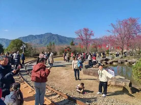 樱花小镇分会场,林间赏花、祈福迎新,沉浸式体验解锁春日新乐趣。漫山樱花次第绽放,如云似霞,游客们穿梭于樱林之间,与樱花共漫步。