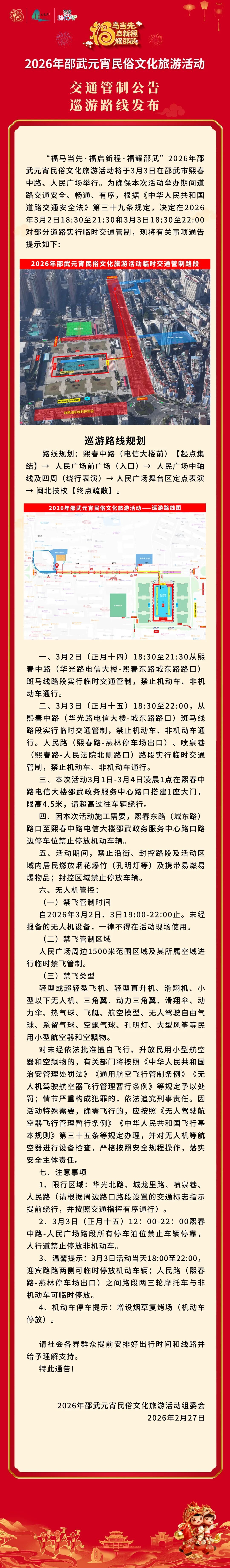 官宣|2026年邵武元宵民俗文化旅游活动交通管制公告巡游路线发布