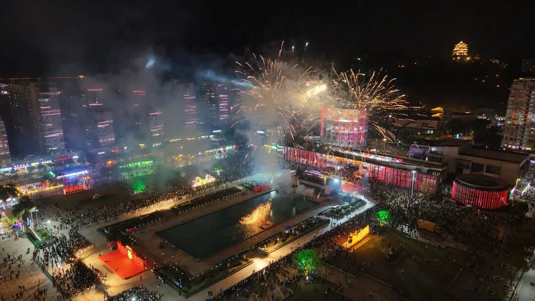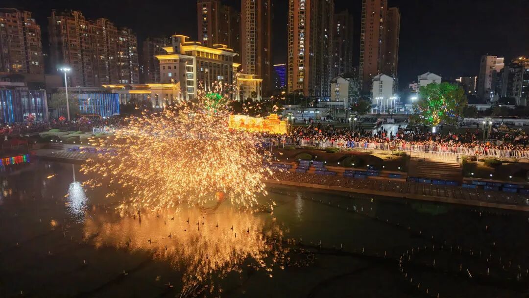 皓月当空,灯火璀璨。活动最后,800架成像无人机腾空而起,在夜空中不断变幻造型,同时地面非遗打铁花惊艳登场,千度高温的铁水被奋力击打,化作漫天繁星。地火天光、灿烂烟花,将整场活动推向高潮。