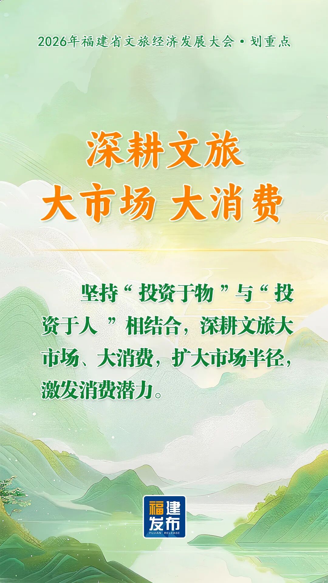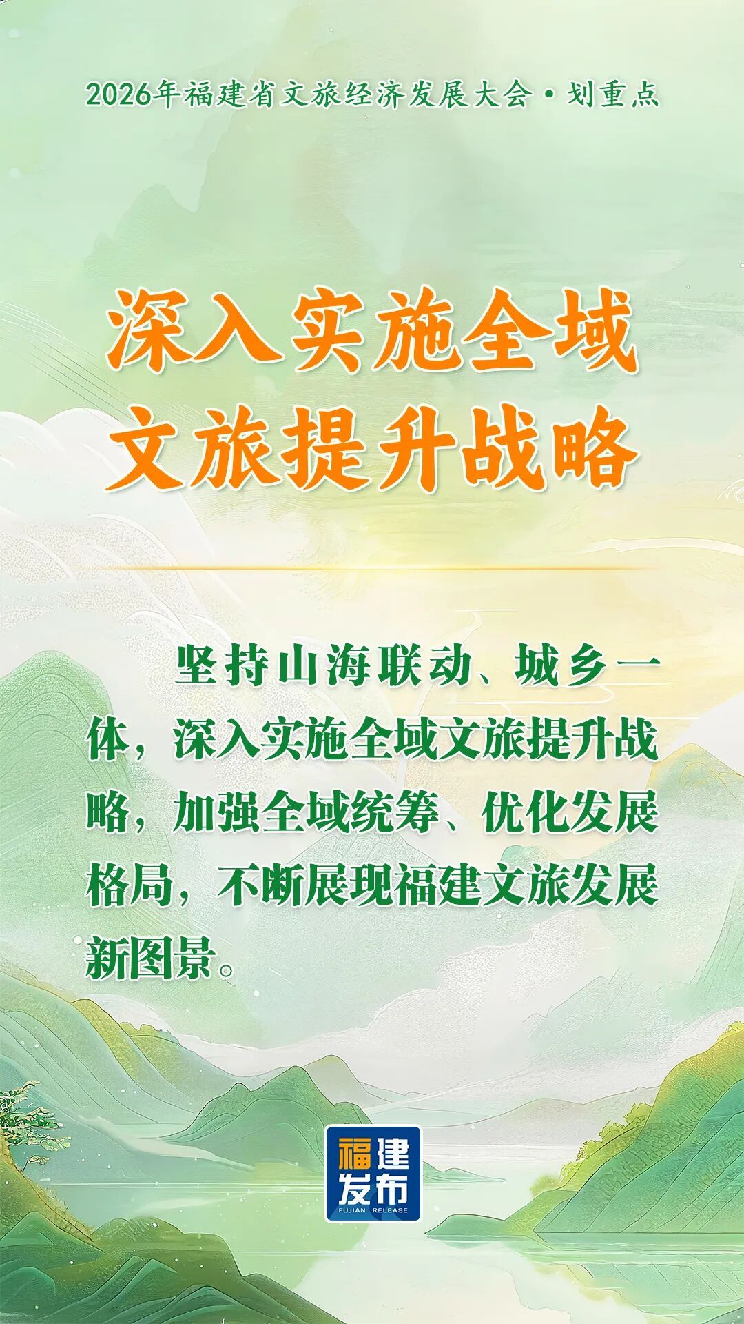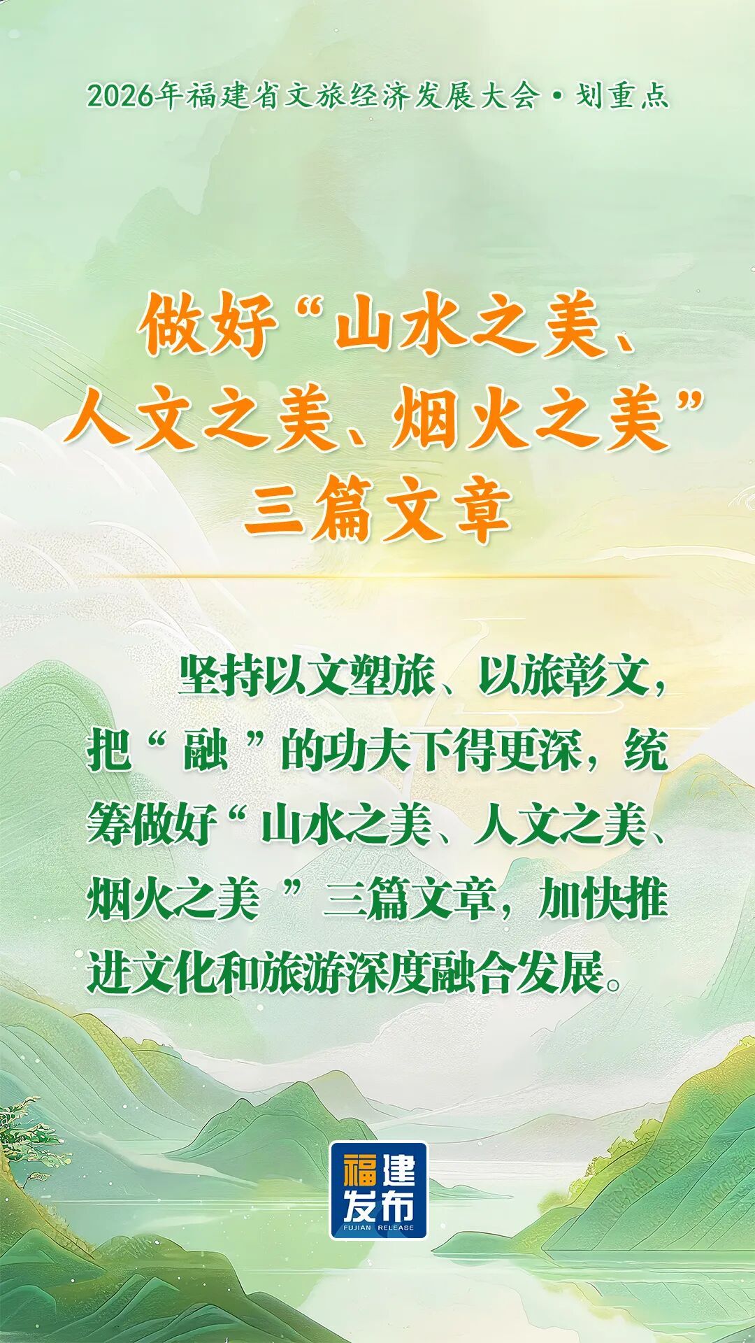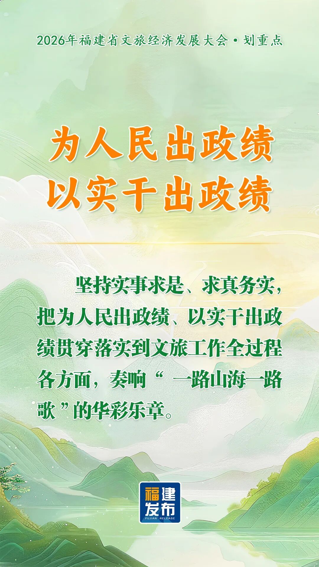 4月18日,2026年福建省文旅经济发展大会在漳州召开。省委书记、省人大常委会主任周祖翼出席并讲话,强调要全面落实习近平总书记关于文化和旅游工作的重要论述和在福建考察时的重要讲话精神,聚焦打造世界知名旅游目的地发展目标、把文化旅游业培育成为支柱产业重要要求、推进文化和旅游深度融合发展实践路径,坚持守正创新、提质增效、融合发展,着力完善现代旅游业体系,在提升文化影响力、展示福建新形象上久久为功,为全省在中国式现代化建设中奋勇争先提供坚实的文旅支撑。省委副书记、省长赵龙主持大会。 让我们通过一组海报 速览大会要点 ↓↓↓