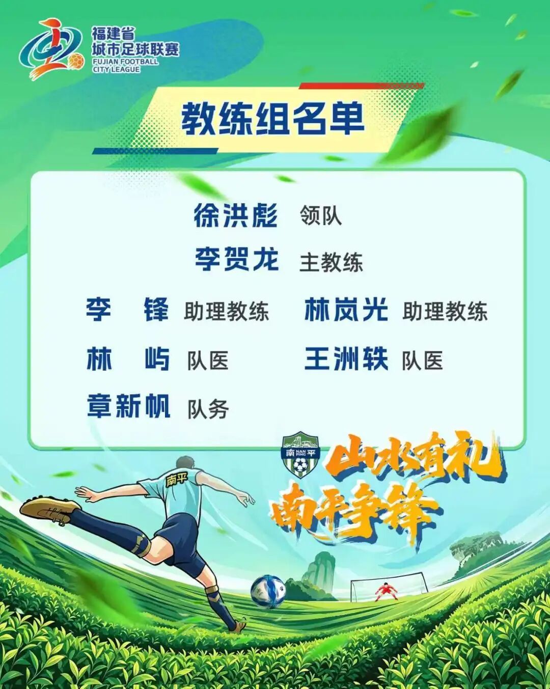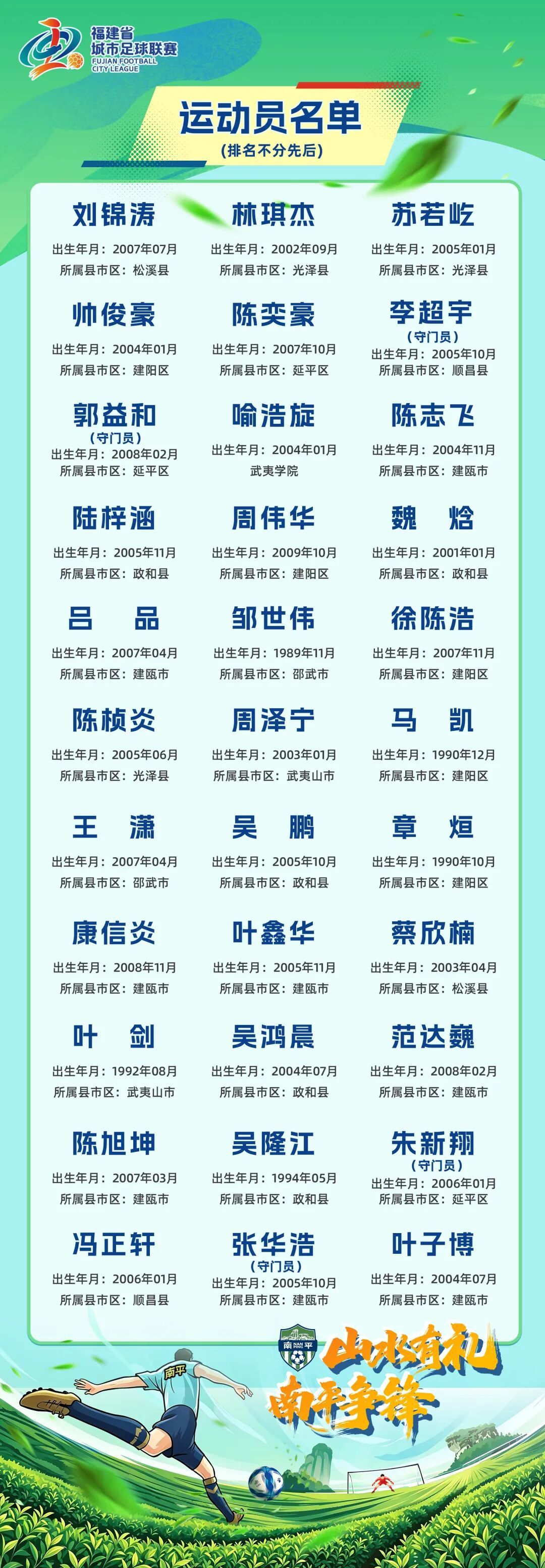 这33人有来自邵武的2名队员 他们代表邵武 也代表南平 (排名不分前后) 🏆 邹世伟(出生年月:1989.11) 2018-2020无锡信捷足球俱乐部(无锡吴钩) 2019江苏省足协冠军联赛冠军 江苏省城市联赛冠军 2022 2023无锡杯十一人制亚军 🏆 王潇(出生年月:2007.04) 2022年福建省省运会第六名 ◀ ▶ 目前 33人已集结完毕 等待他们的是“闽超”的绿茵赛场 我们不需要喊“必胜”的口号 我们只说 让全省看到 南平人踢球的样子 让“闽超”记住 邵武走出来的这2个身影 南平队,加油! 邵武2位健儿,冲! 编辑:朱绮文 审核:缪顺春 李婷 终审:陈一沿 |